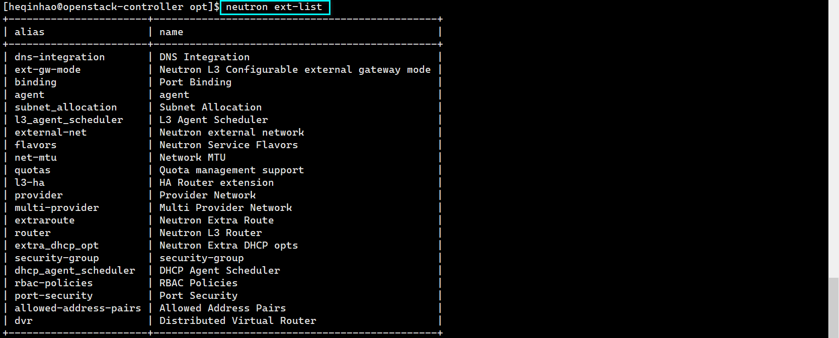列出加载的扩展,对 neutron-server 进程是否启动正常进行验证
